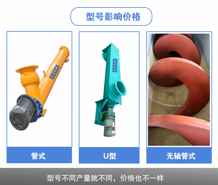 管式螺旋給料機分為管式、U型及無軸管式螺旋給料機等三種類型,不同類型的輸送機有不同的型號,這些都會影響管式螺旋給料機的價格,同一類型,型號越大的管式螺旋給料機產量就大,設備的價格越大,產量越小,價格就相對低一些。