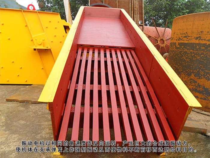 主要由一對(duì)性能參數(shù)完全相同的振動(dòng)電機(jī)為激振源,當(dāng)兩臺(tái)振動(dòng)電機(jī)以相同的角速度作反向運(yùn)轉(zhuǎn)時(shí),其偏心塊所產(chǎn)生的慣性力在特定的相位重復(fù)疊加或抵消。從而產(chǎn)生巨大的合成激振動(dòng)力,使機(jī)體在支承彈簧上作強(qiáng)制振動(dòng),并以此振動(dòng)為動(dòng)力,帶動(dòng)物料在料槽上作滑動(dòng)及拋擲運(yùn)動(dòng),從而使物料不斷前移而達(dá)到給料目的。