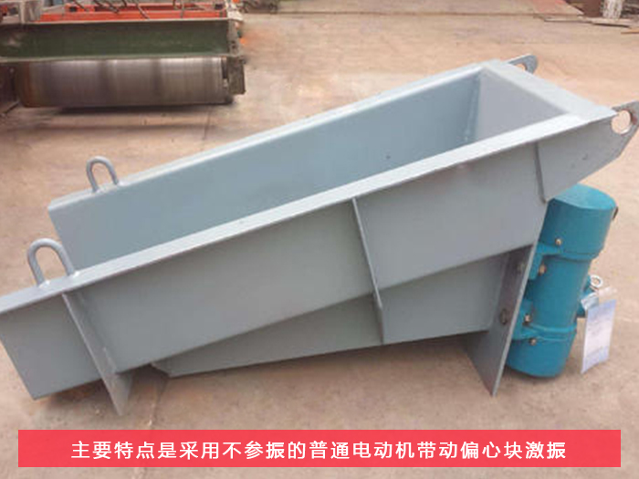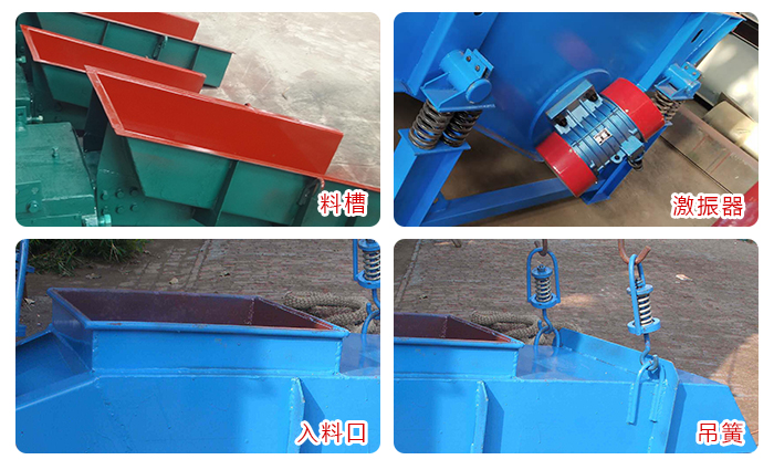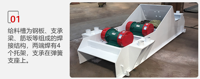 1.給料槽為鋼板、支承梁、筋坂等組成的焊接結構,兩端焊有4個托架,支承在彈簧支座上。振動器為雙軸強迫同步的塊偏心振動器,兩根軸上的偏心塊齒輪裝置保持反向旋轉。振動器運動軌跡為與槽體成30度角的直線,給料機的入料端和出料端的運動軌跡呈扁平的橢圓形。